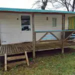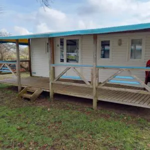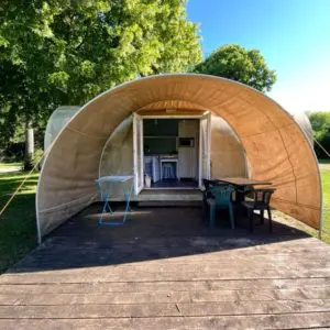 These TRIGANOS are mobile homes for 2 people, they are composed of a bedroom, a bathroom and a common area including a dining area with a bench.